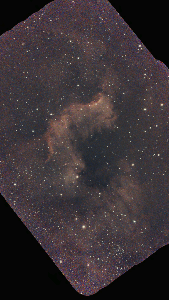 J’ai également exploré les fonctionnalités « champ large » du Seestar – en gros, sa capacité à réaliser automatiquement des mosaïques d’objets célestes trop étendus pour tenir dans le capteur, et ciblé NGC 7000. Exercice plaisant : pièce par pièce, la nébuleuse apparaît progressivement à l’écran, façon puzzle :