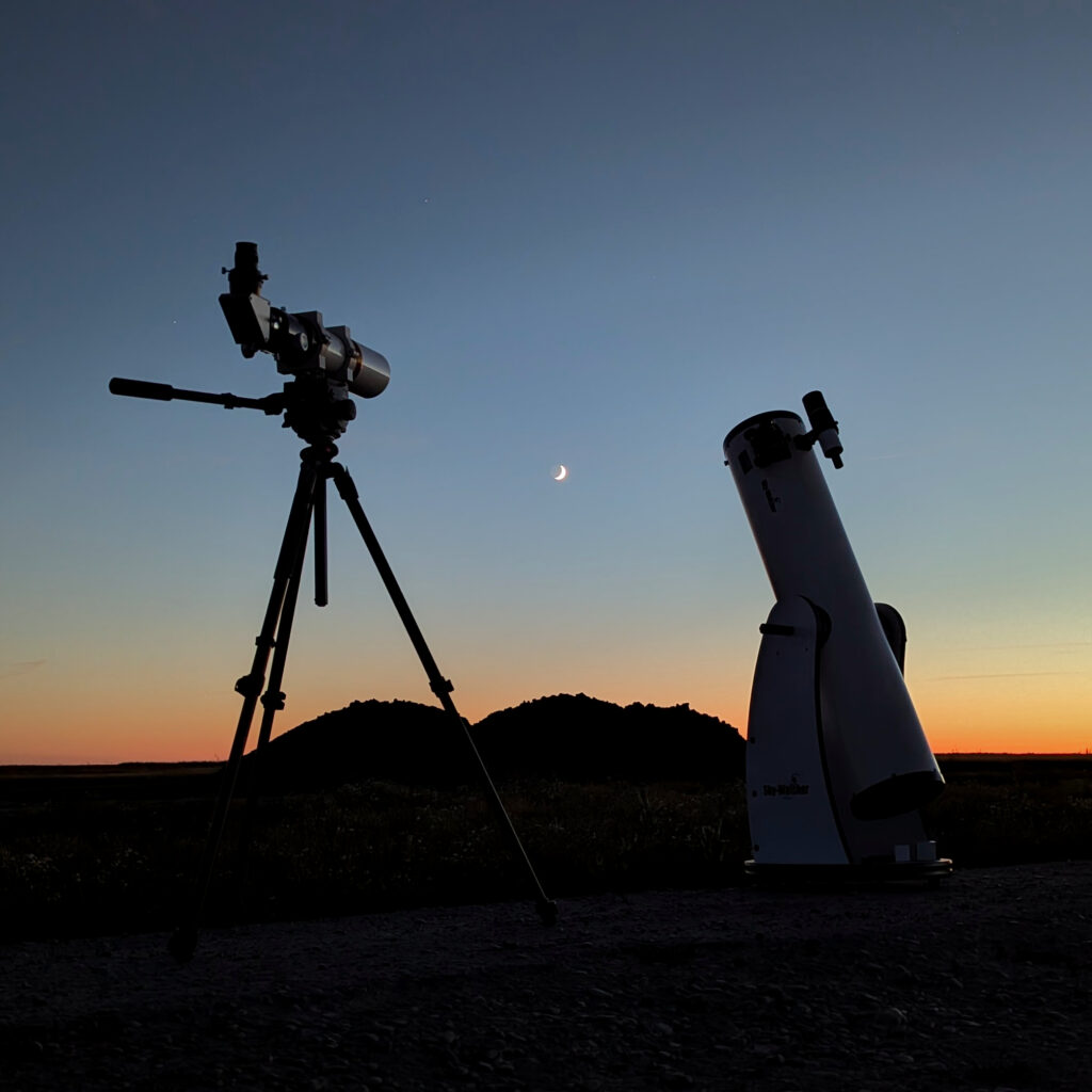 Ce pourrait être l’histoire de deux instruments qui n’avaient pas vu les étoiles depuis longtemps et qui se sont retrouvés sous le clair de Lune, un beau soir d’été. Télescope, de l’aveu de Christelle, sa propriétaire, n’avait pas vu la lumière du jour depuis plusieurs mois. Et Lunette, ma fidèle Megrez 80, n’était pas sortie de sa valise en toile depuis … des années. Que de temps à rattraper !