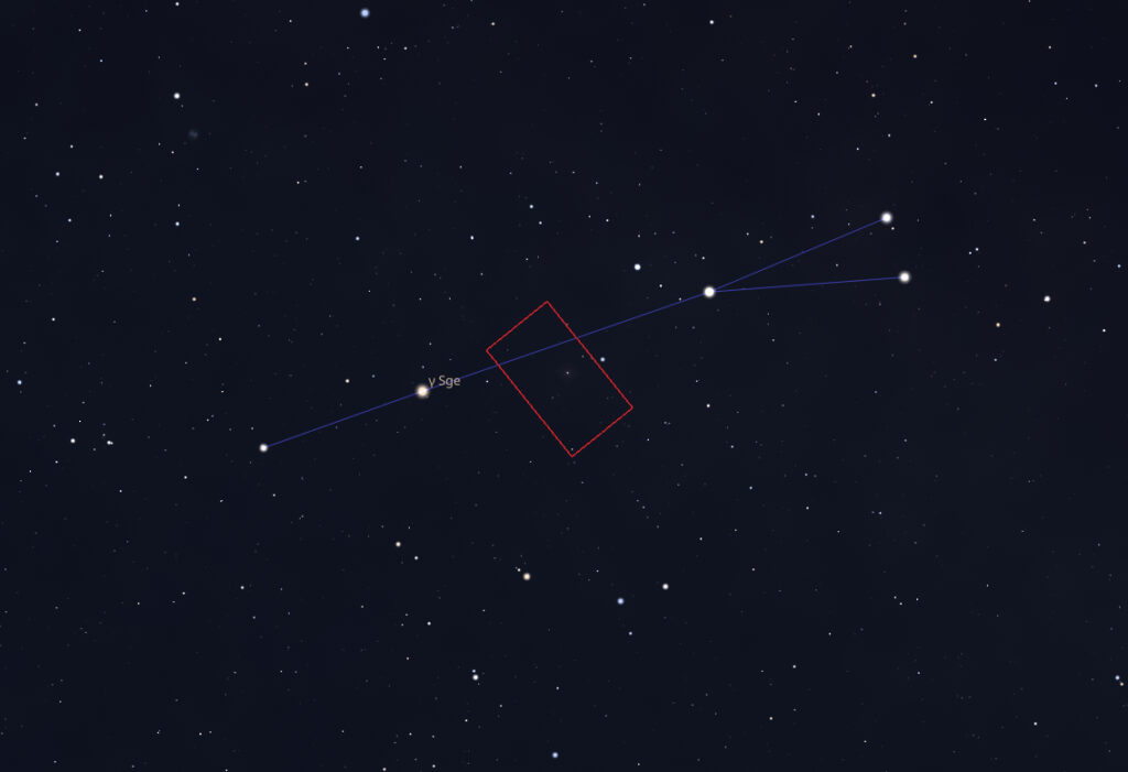 Et pourtant, voici quelques bonnes raisons d’aller lui rendre visite. Tout d’abord, la localisation : M 71 bénéficie d’un bel emplacement dans le ciel, au cœur du triangle d’été, ce qui en fait une cible facile à pointer. Il suffit de viser Gamma de la Flèche, la pointe de la constellation, et nous sommes presque arrivés !