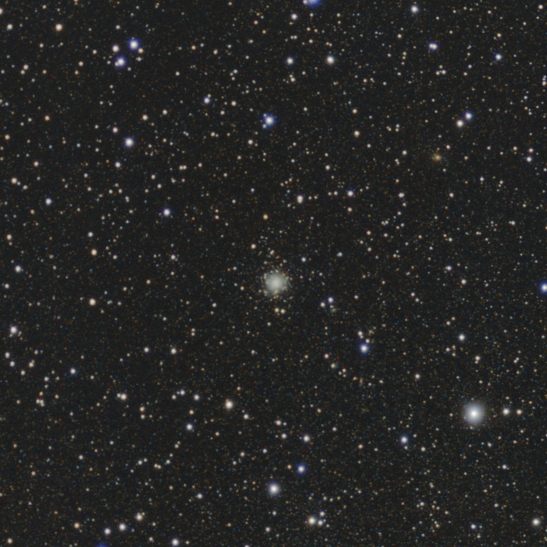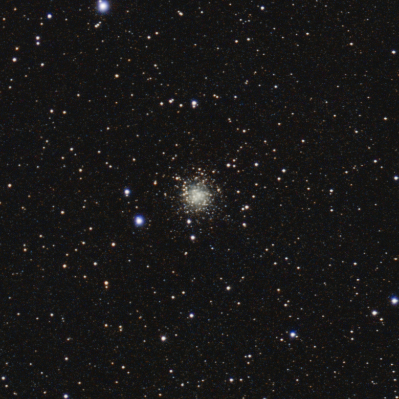 Baignant dans un champ riche en étoiles, l’amas apparaît au T250 comme une petite tache floue assez uniforme, qui se confond avec les étoiles brillantes qui l’entourent.